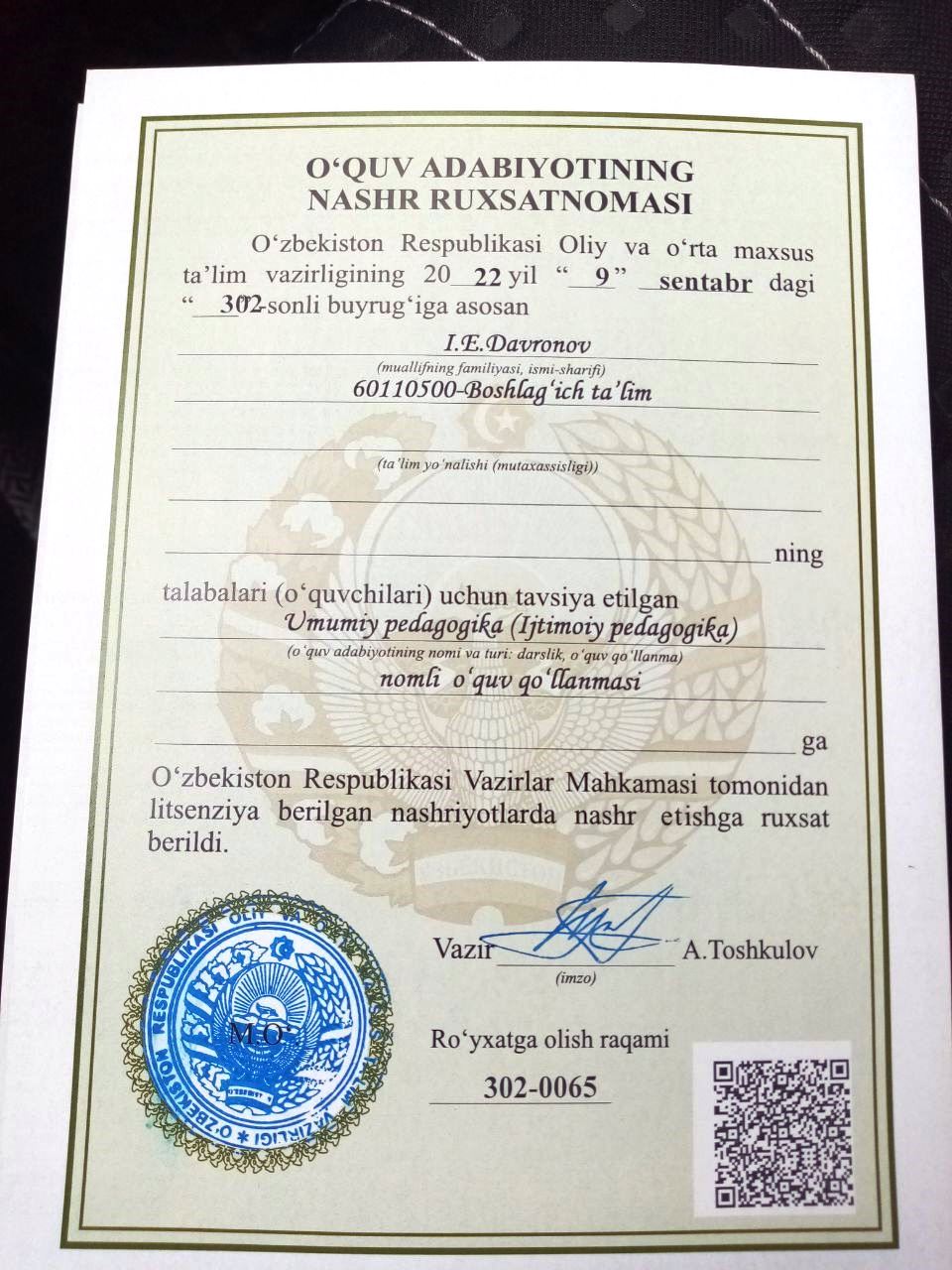 Nashrga ruxsatnomasi buyruq raqami: