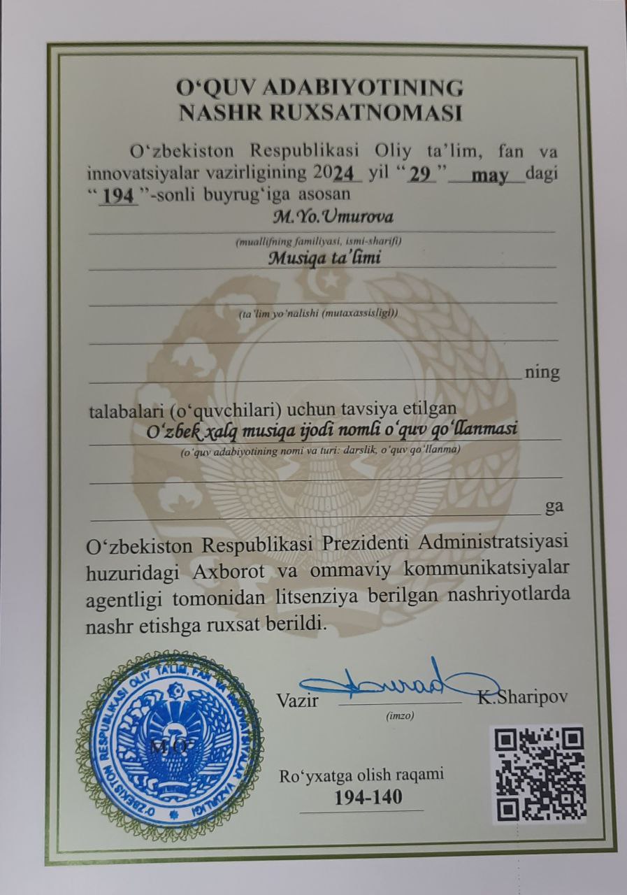 Ta`lim yo`nalishi (yoki mutaxassisligi) shifri va nomi: