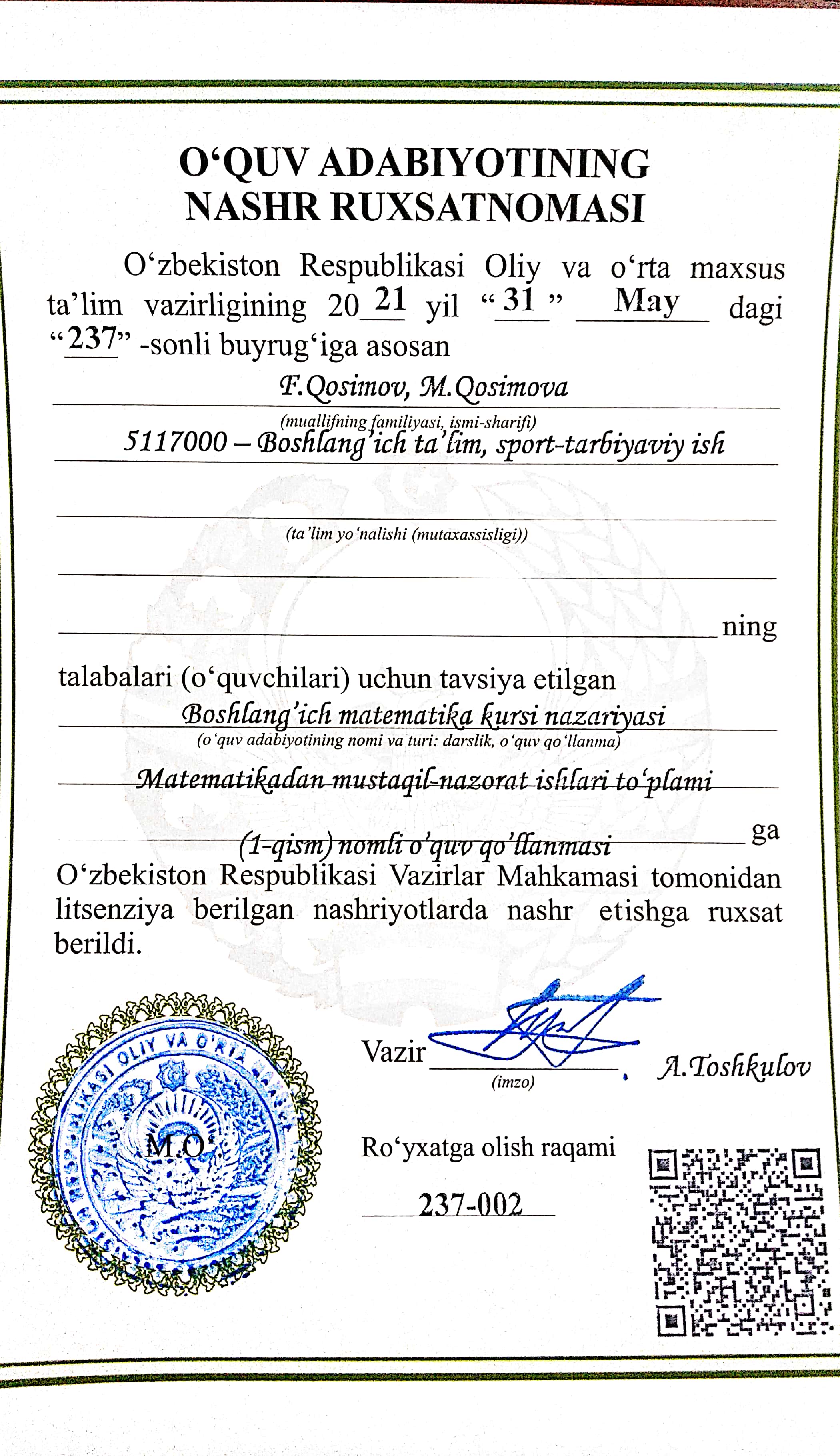 Nashrga ruxsatnomasi buyruq raqami: